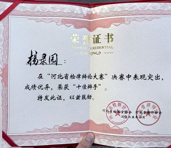 2025年7月31日近日,河北省检律辩论赛巅峰对决落幕,我所律师杨录园凭借过硬专业素养与精彩表现,从全省顶尖选手中突围,斩获“十佳辩手”称号!